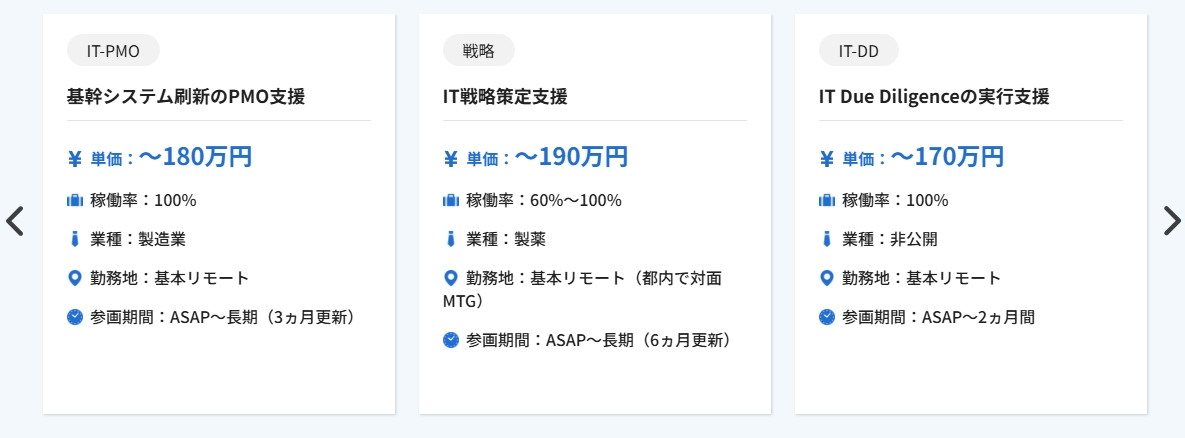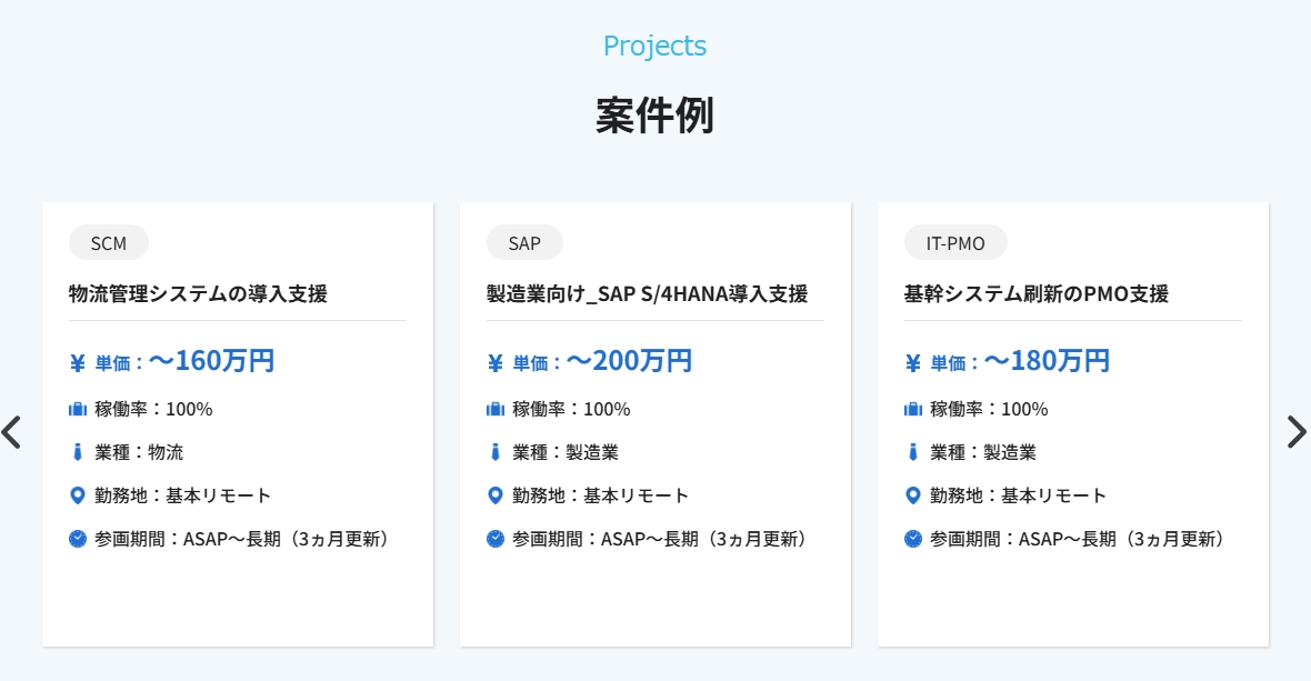 | システム導入支援系 | ERP(例:SAP)導入支援、要件定義、ベンダー選定、進行管理 |